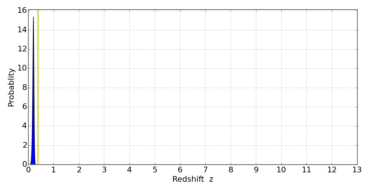 In P(z) plots: Yellow lines mark the cluster redshift z = 0.383,