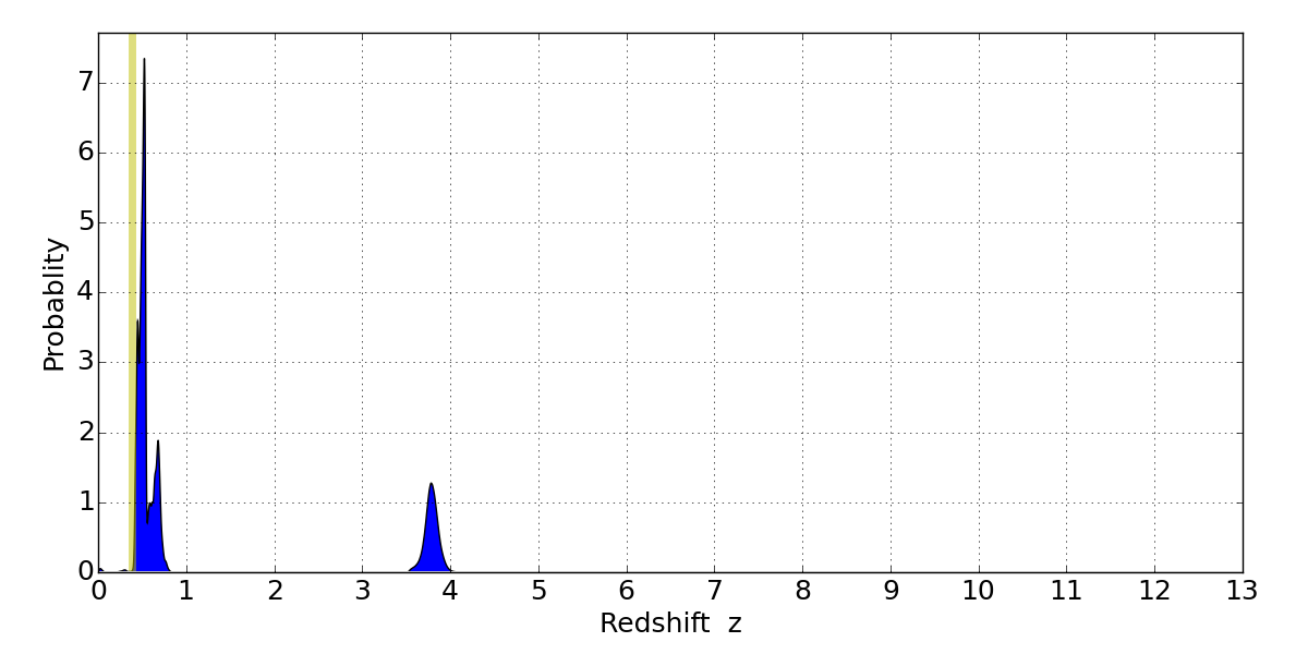 In P(z) plots: Yellow lines mark the cluster redshift z = 0.383,