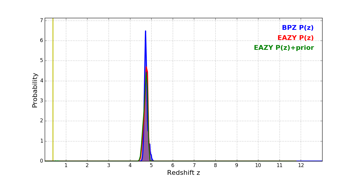In P(z) plots: Yellow lines mark the cluster redshift z = 0.383,