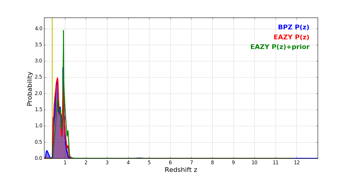 In P(z) plots: Yellow lines mark the cluster redshift z = 0.383,