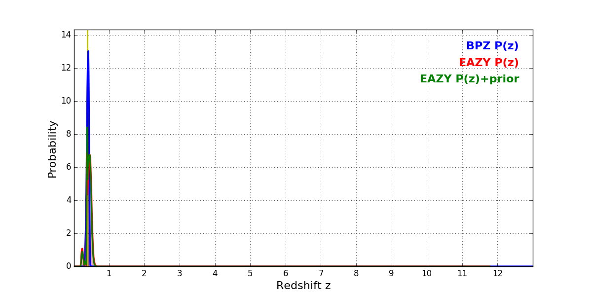 In P(z) plots: Yellow lines mark the cluster redshift z = 0.383,