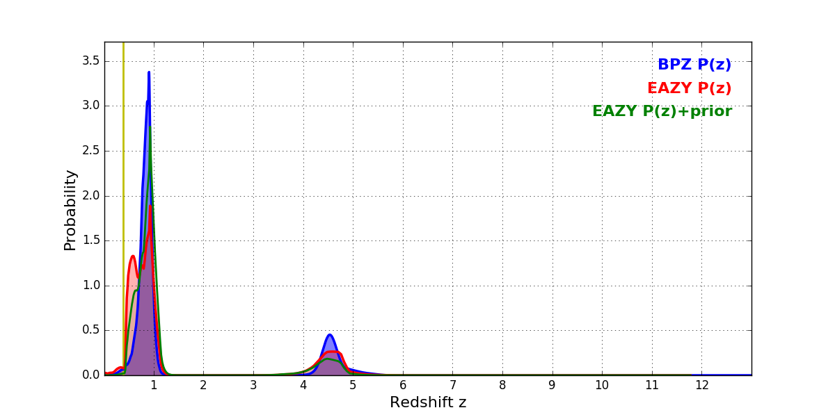 In P(z) plots: Yellow lines mark the cluster redshift z = 0.383,