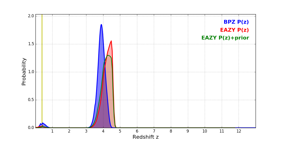 In P(z) plots: Yellow lines mark the cluster redshift z = 0.383,