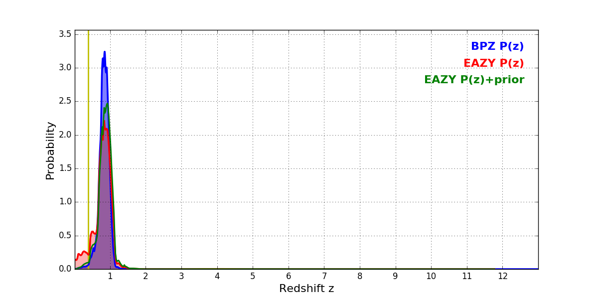 In P(z) plots: Yellow lines mark the cluster redshift z = 0.383,