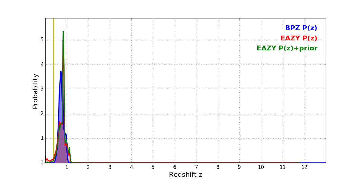 In P(z) plots: Yellow lines mark the cluster redshift z = 0.383,