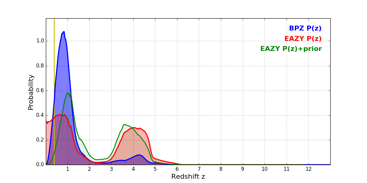 In P(z) plots: Yellow lines mark the cluster redshift z = 0.383,
