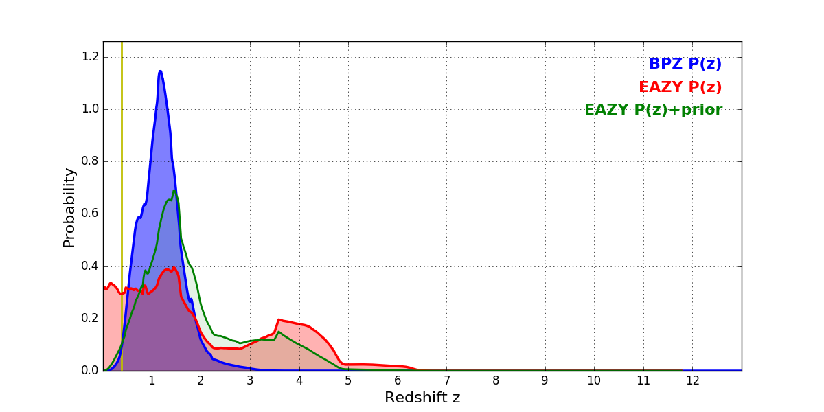 In P(z) plots: Yellow lines mark the cluster redshift z = 0.383,