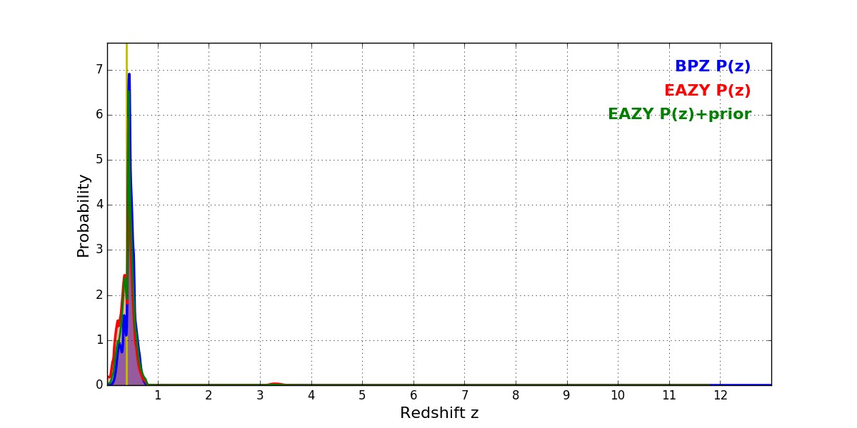 In P(z) plots: Yellow lines mark the cluster redshift z = 0.383,