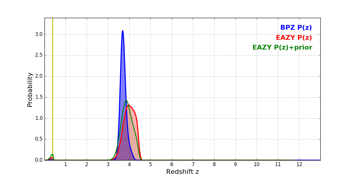 In P(z) plots: Yellow lines mark the cluster redshift z = 0.383,