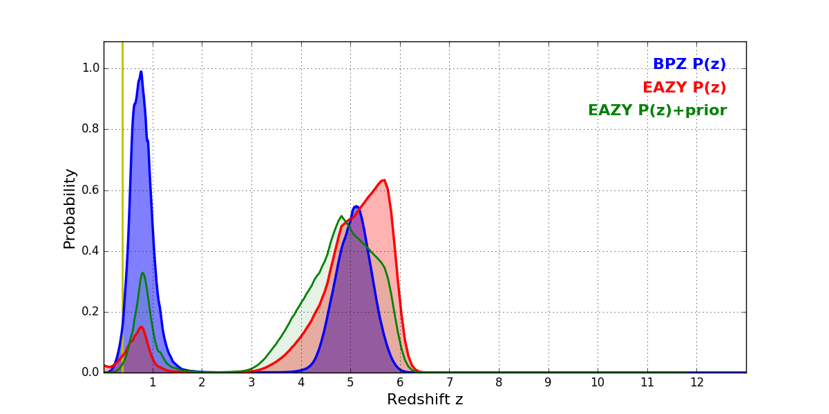 In P(z) plots: Yellow lines mark the cluster redshift z = 0.383,