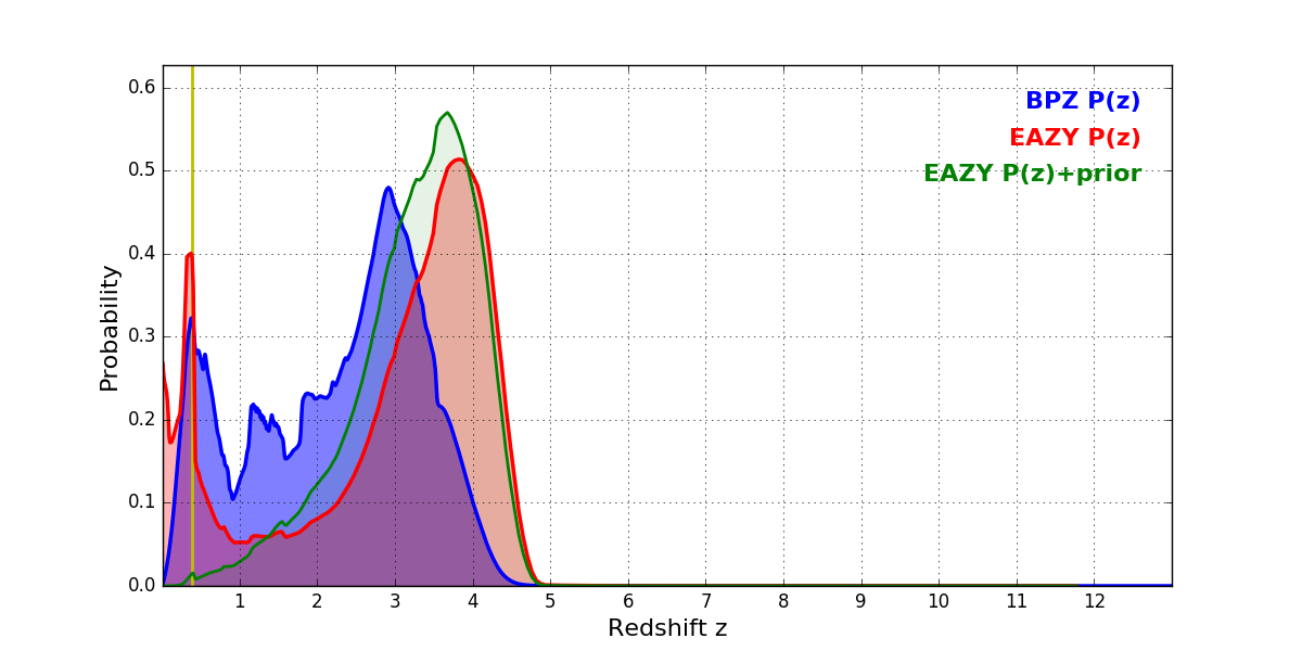 In P(z) plots: Yellow lines mark the cluster redshift z = 0.383,