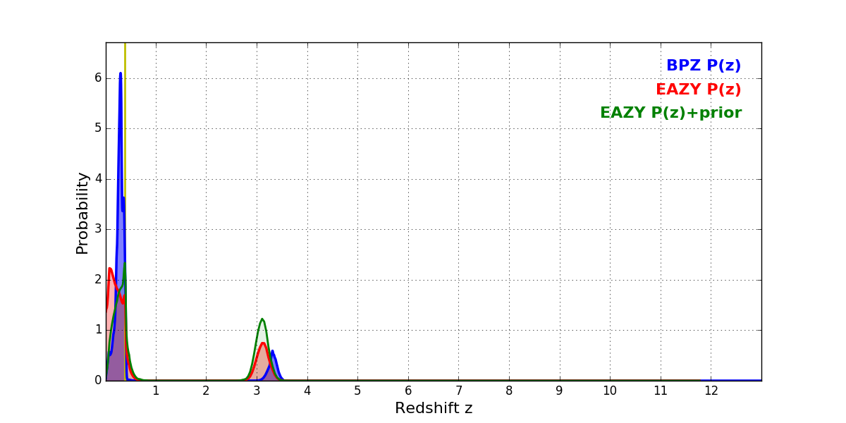 In P(z) plots: Yellow lines mark the cluster redshift z = 0.383,