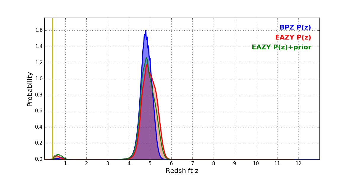 In P(z) plots: Yellow lines mark the cluster redshift z = 0.383,