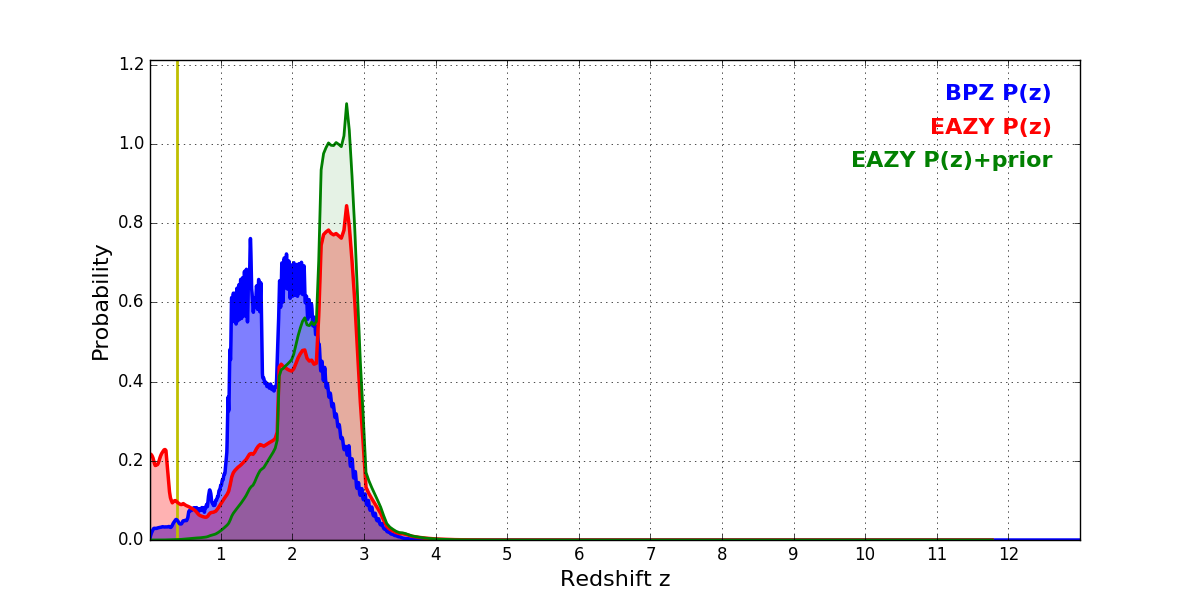 In P(z) plots: Yellow lines mark the cluster redshift z = 0.383,
