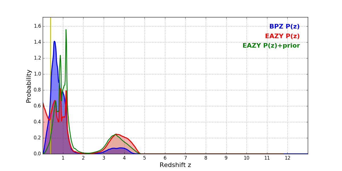 In P(z) plots: Yellow lines mark the cluster redshift z = 0.383,