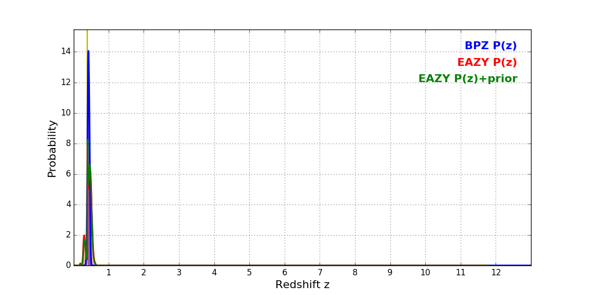 In P(z) plots: Yellow lines mark the cluster redshift z = 0.383,
