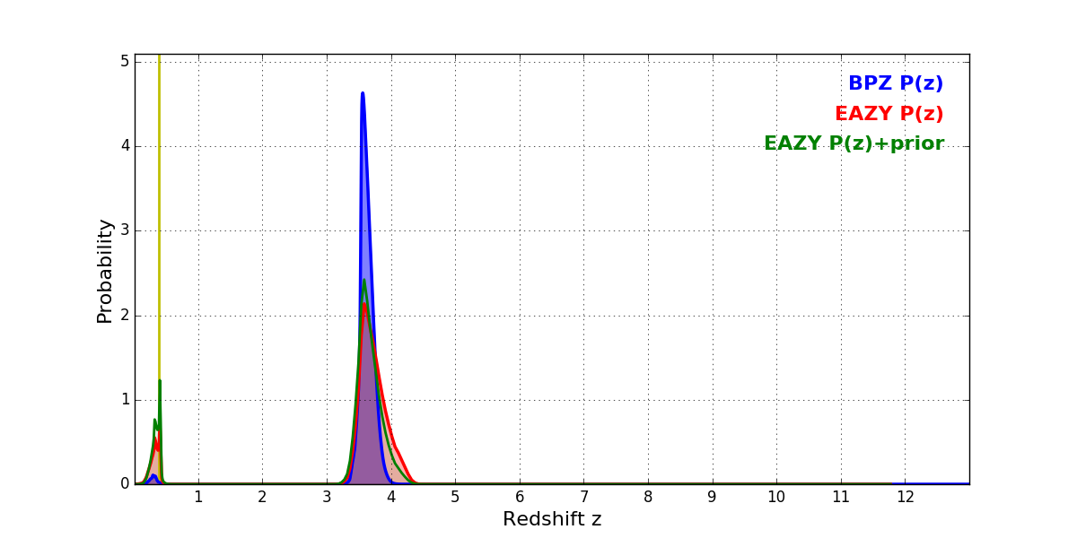 In P(z) plots: Yellow lines mark the cluster redshift z = 0.383,