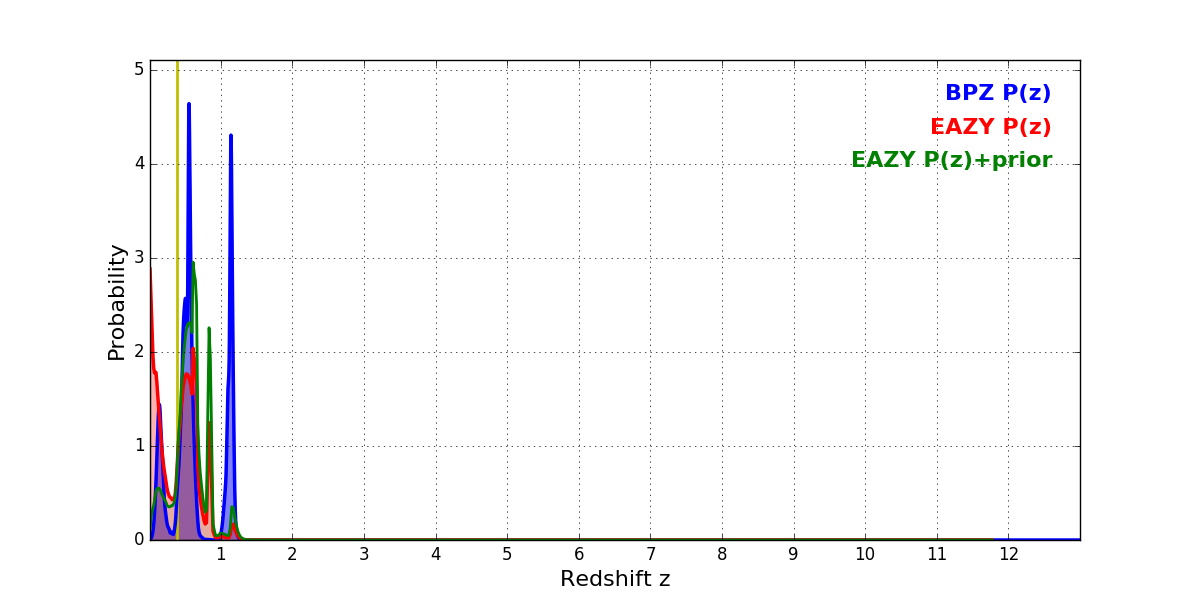 In P(z) plots: Yellow lines mark the cluster redshift z = 0.383,