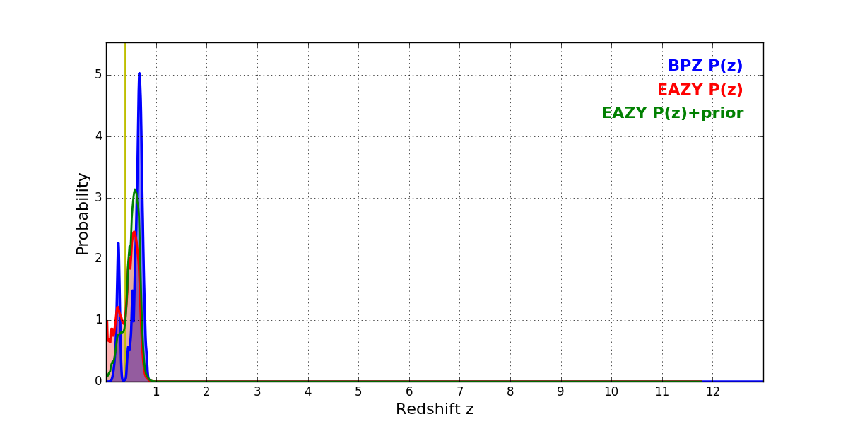 In P(z) plots: Yellow lines mark the cluster redshift z = 0.383,