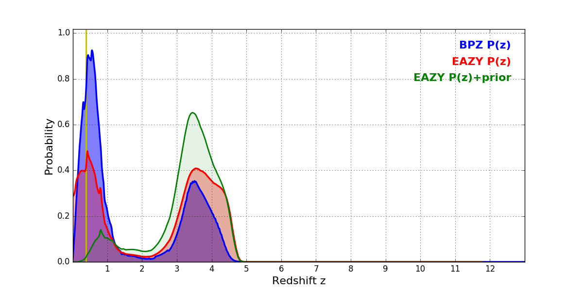 In P(z) plots: Yellow lines mark the cluster redshift z = 0.383,