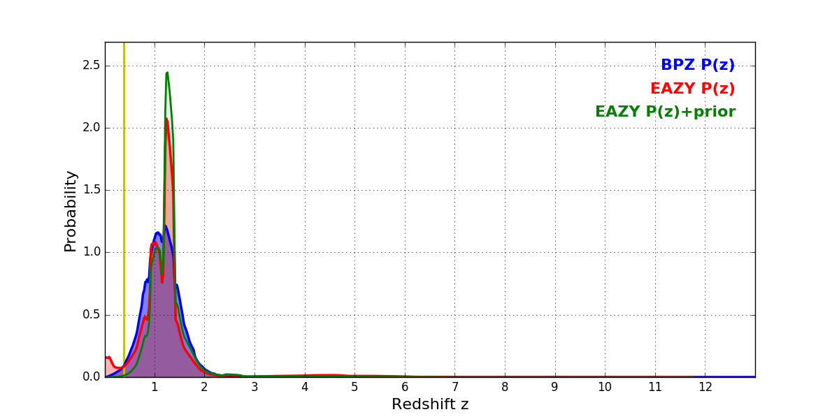 In P(z) plots: Yellow lines mark the cluster redshift z = 0.383,