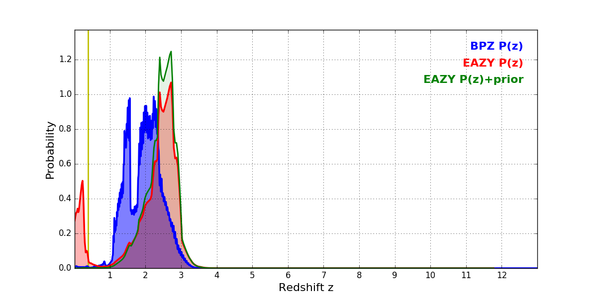 In P(z) plots: Yellow lines mark the cluster redshift z = 0.383,