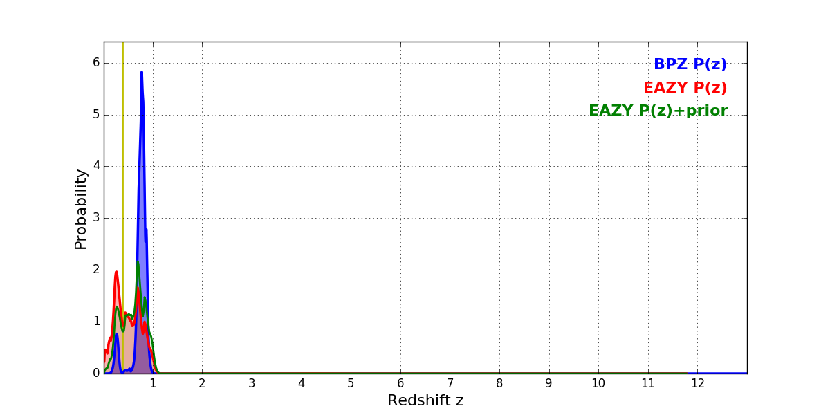 In P(z) plots: Yellow lines mark the cluster redshift z = 0.383,