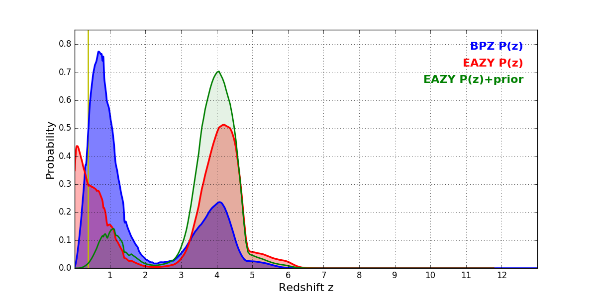 In P(z) plots: Yellow lines mark the cluster redshift z = 0.383,