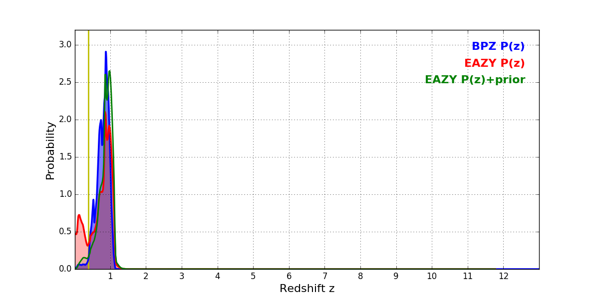 In P(z) plots: Yellow lines mark the cluster redshift z = 0.383,