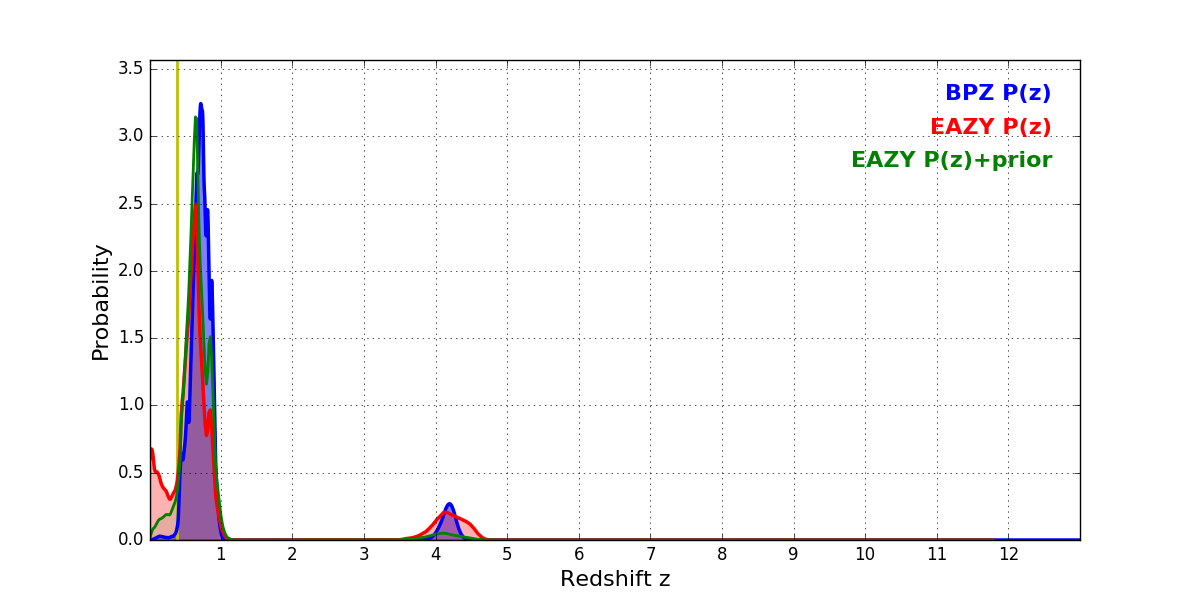 In P(z) plots: Yellow lines mark the cluster redshift z = 0.383,