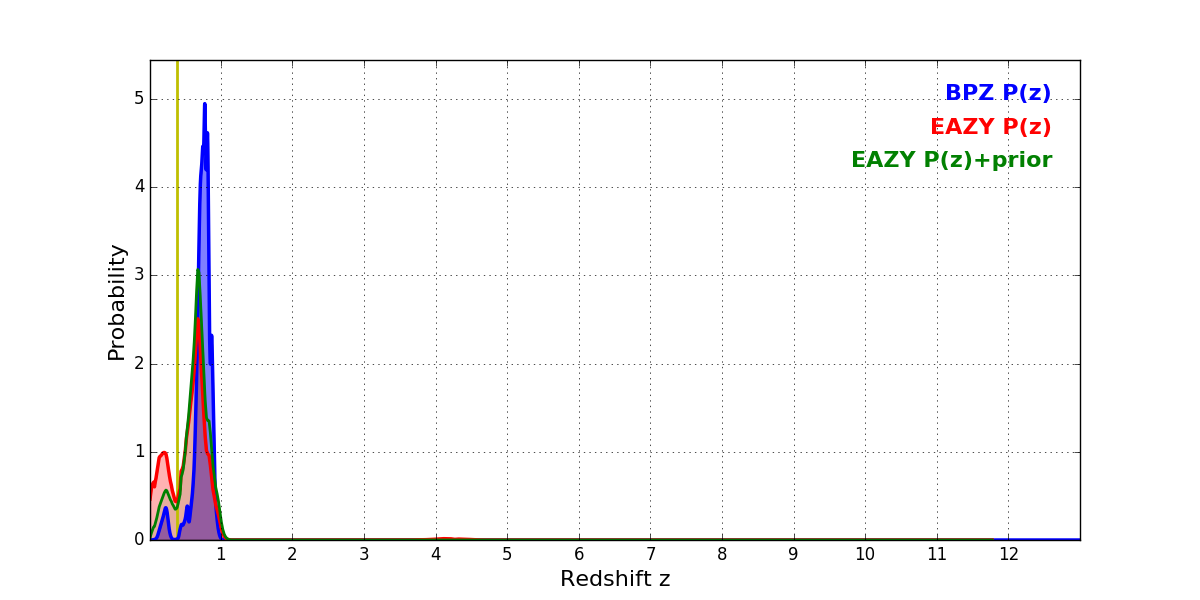 In P(z) plots: Yellow lines mark the cluster redshift z = 0.383,