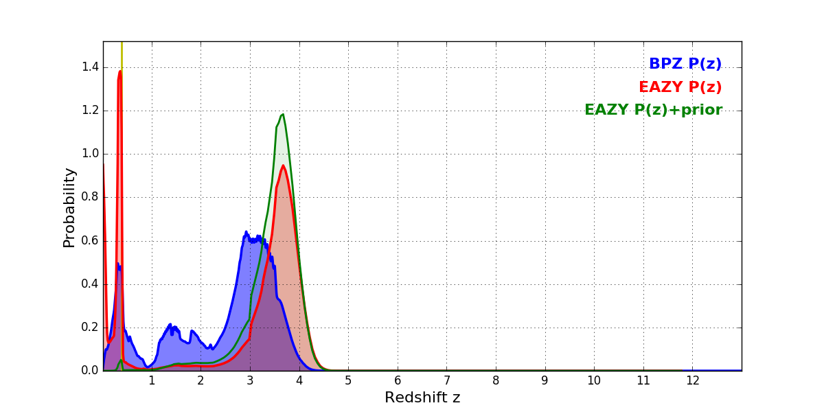 In P(z) plots: Yellow lines mark the cluster redshift z = 0.383,