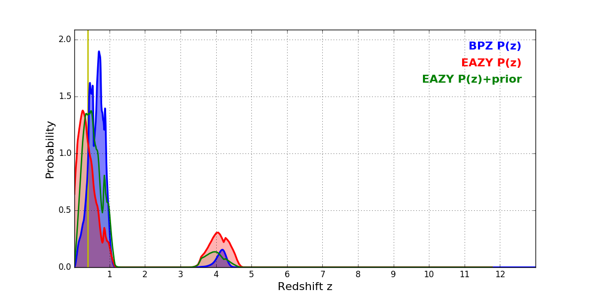 In P(z) plots: Yellow lines mark the cluster redshift z = 0.383,