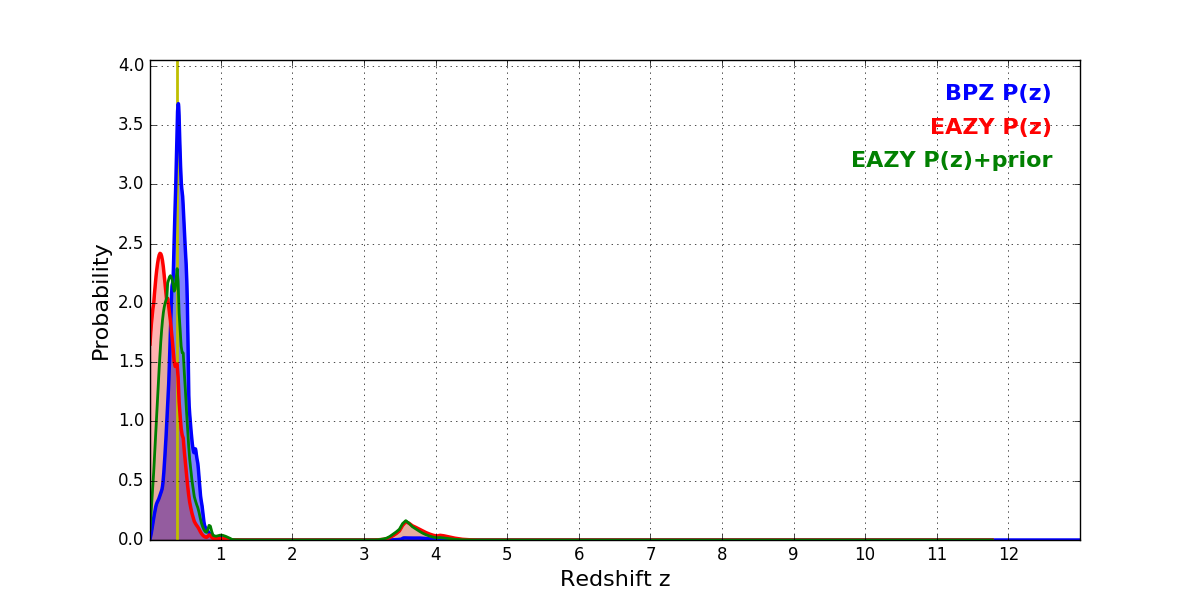 In P(z) plots: Yellow lines mark the cluster redshift z = 0.383,