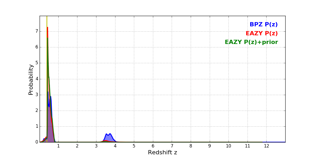 In P(z) plots: Yellow lines mark the cluster redshift z = 0.383,