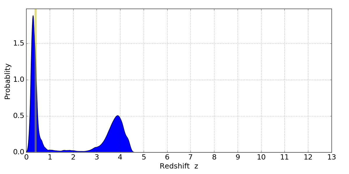 In P(z) plots: Yellow lines mark the cluster redshift z = 0.397,