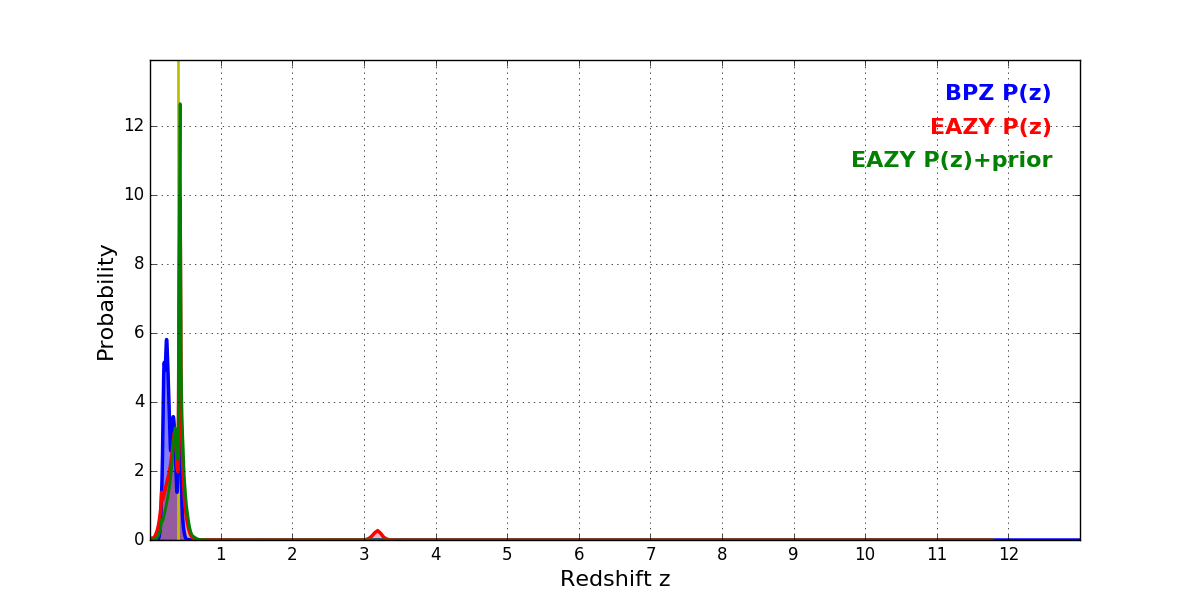 In P(z) plots: Yellow lines mark the cluster redshift z = 0.397,