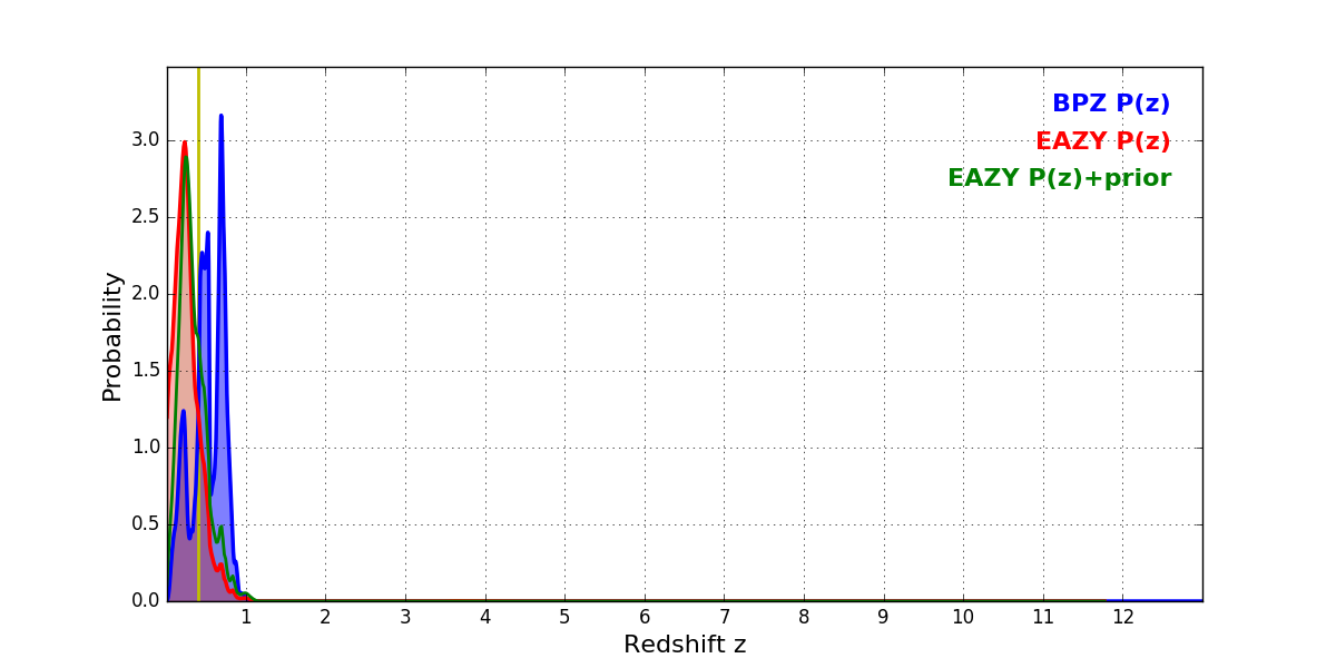 In P(z) plots: Yellow lines mark the cluster redshift z = 0.397,