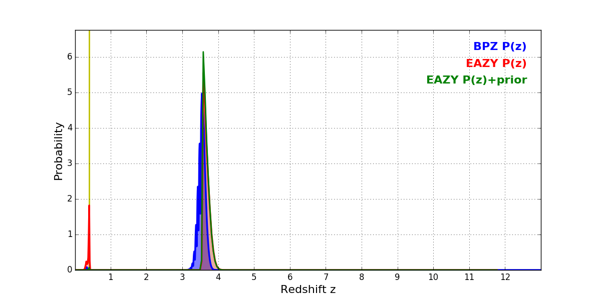 In P(z) plots: Yellow lines mark the cluster redshift z = 0.397,
