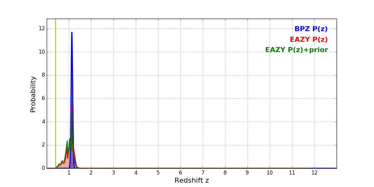 In P(z) plots: Yellow lines mark the cluster redshift z = 0.397,