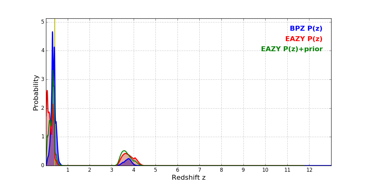 In P(z) plots: Yellow lines mark the cluster redshift z = 0.397,