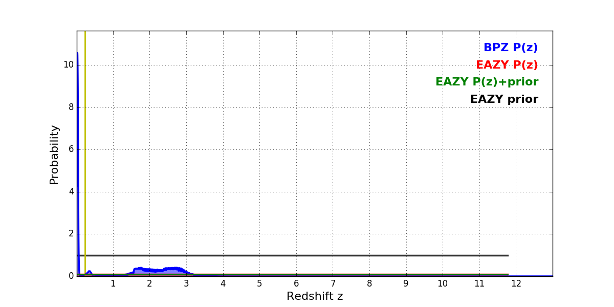 In P(z) plots: Yellow lines mark the cluster redshift z = 0.228,