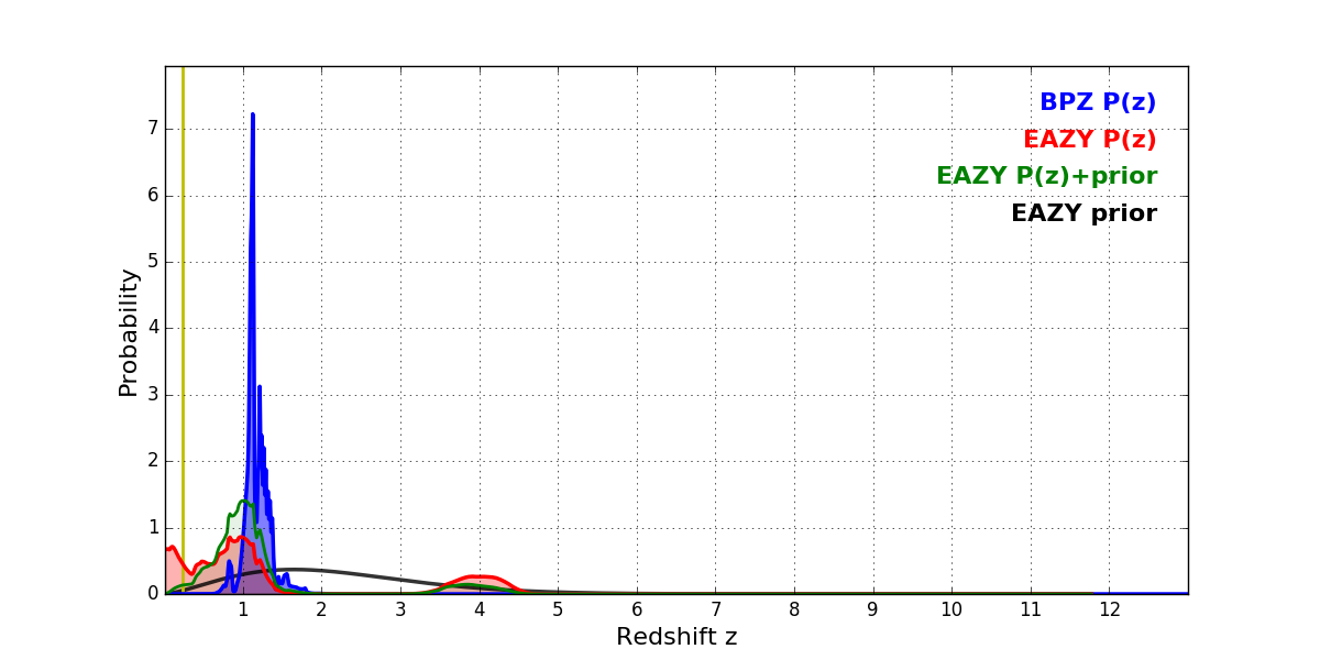 In P(z) plots: Yellow lines mark the cluster redshift z = 0.228,