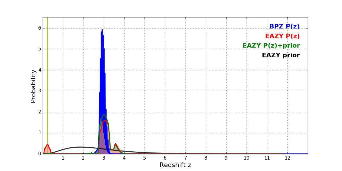 In P(z) plots: Yellow lines mark the cluster redshift z = 0.228,
