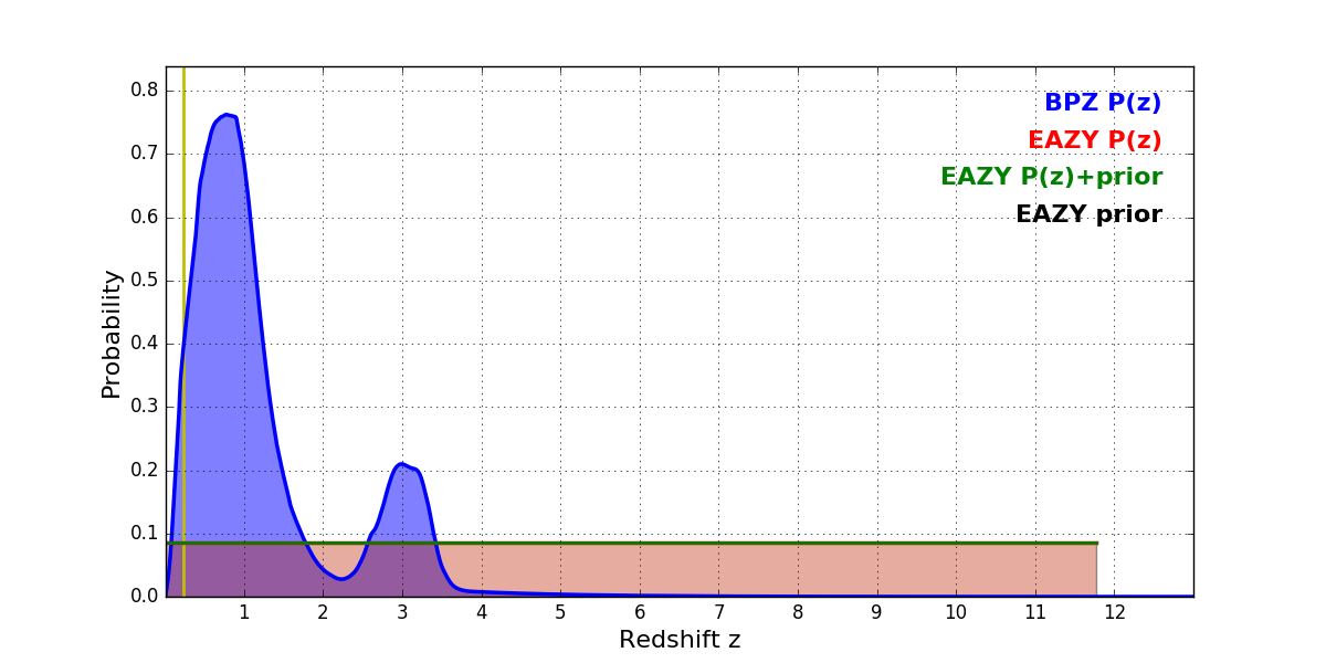 In P(z) plots: Yellow lines mark the cluster redshift z = 0.228,