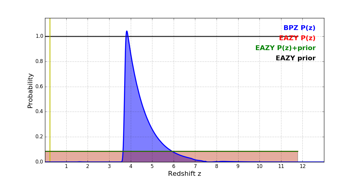 In P(z) plots: Yellow lines mark the cluster redshift z = 0.228,