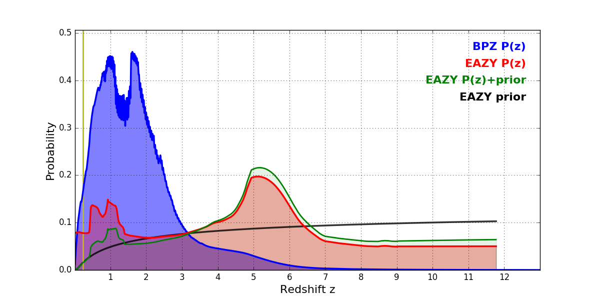 In P(z) plots: Yellow lines mark the cluster redshift z = 0.228,