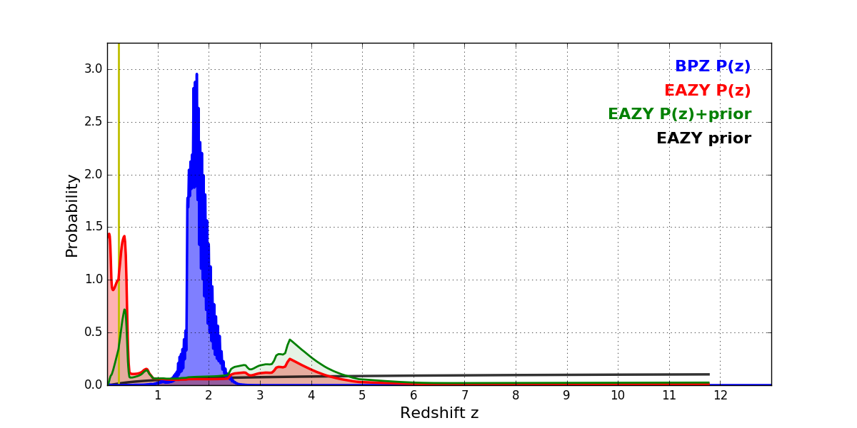 In P(z) plots: Yellow lines mark the cluster redshift z = 0.228,
