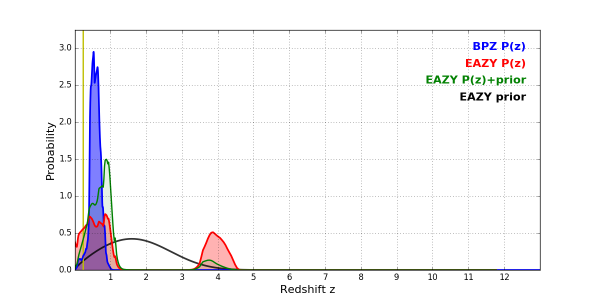 In P(z) plots: Yellow lines mark the cluster redshift z = 0.228,
