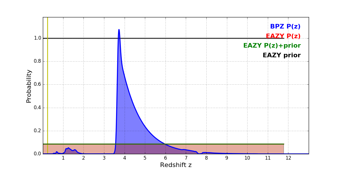 In P(z) plots: Yellow lines mark the cluster redshift z = 0.228,